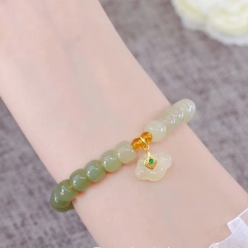 商品名称:和田玉渐变圆珠2024新款轻奢精致仿天然和田玉手串 搭配如意锁 中国风单圈手链蝴蝶结礼盒 包邮