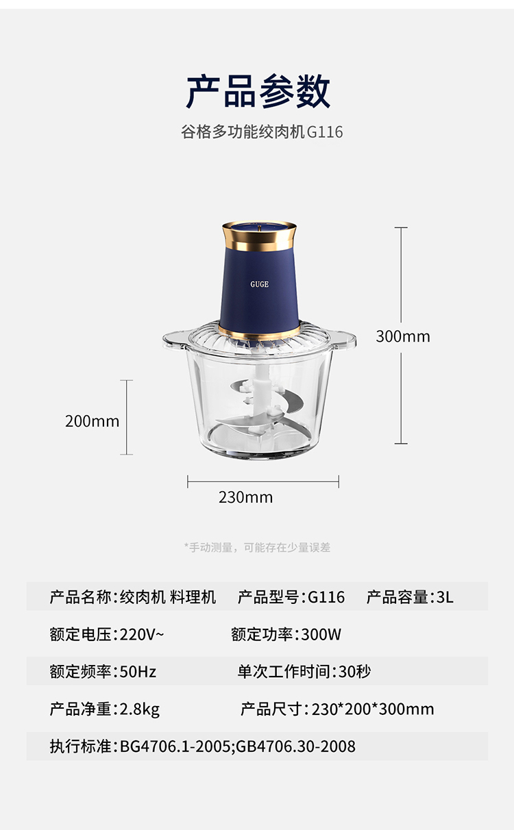 商品名称:谷格 (GUGE) 绞肉机 G116 额定容量:3L 三挡功能,微动开关设计