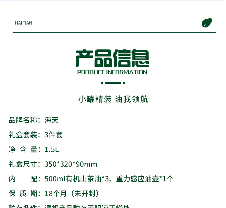商品名称:海天 有机山茶油 1.5L铁罐三件套HT-S301T 500ml有机山茶油*3 重力感应油壶*1个