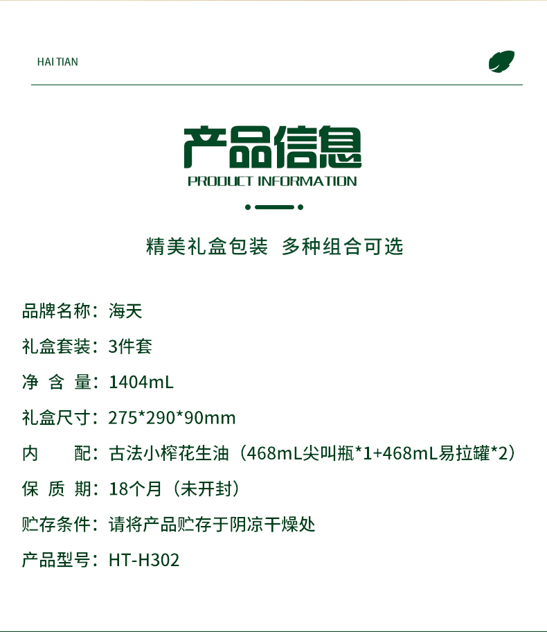 商品名称:海天 古法小榨花生油三件套 HT-H302 468ml古法小榨花生油*3 古法小榨 见精细 取初榨