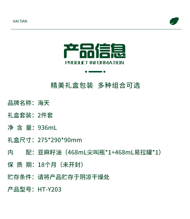 商品名称:海天 亚麻籽油二件套 HT-Y203 468ml亚麻籽油*2 亚麻酸大于52%