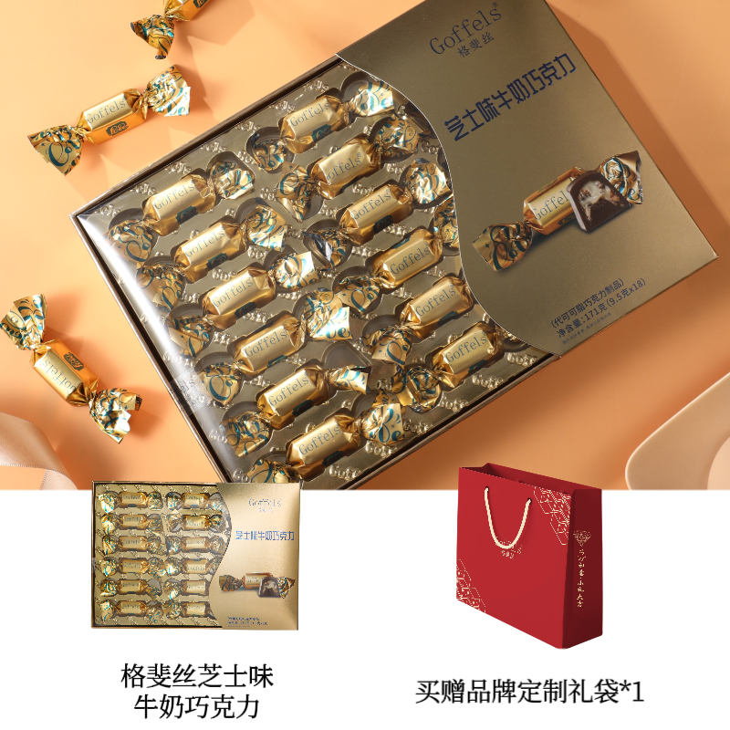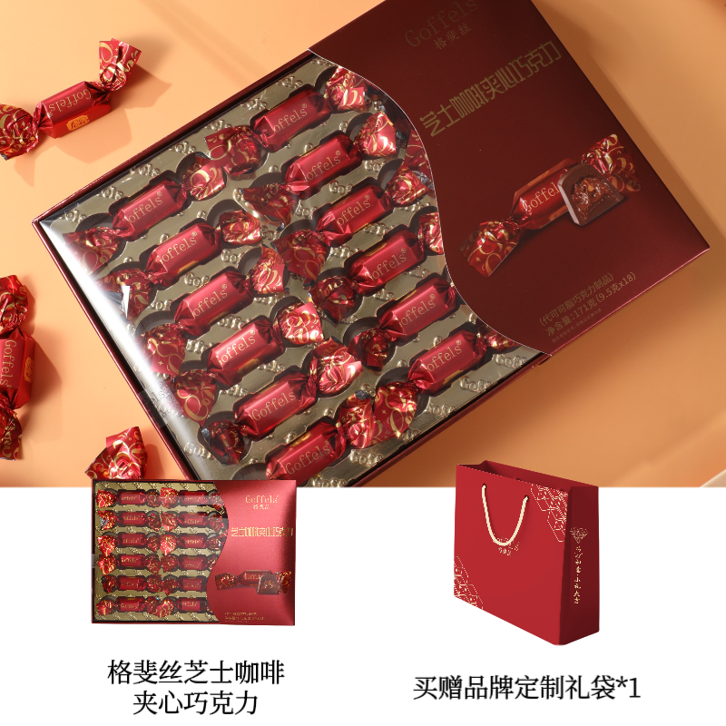 商品名称:格斐丝 芝士味牛奶/芝士咖啡夹心巧克力礼盒171g*18粒装 三层夹心坚果碎软心巧克力