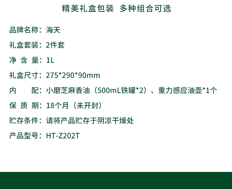 商品名称:海天 小磨芝麻香油 1L铁罐二件套HT-Z202T 500ml小磨芝麻香油*2 重力感应油壶*1个