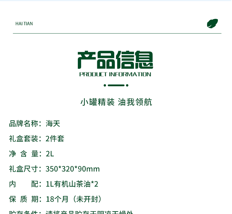 商品名称:海天 有机山茶油 2L铁罐二件套HT-S203TL 1L有机山茶油*2 80%左右高油酸 轻脂肪