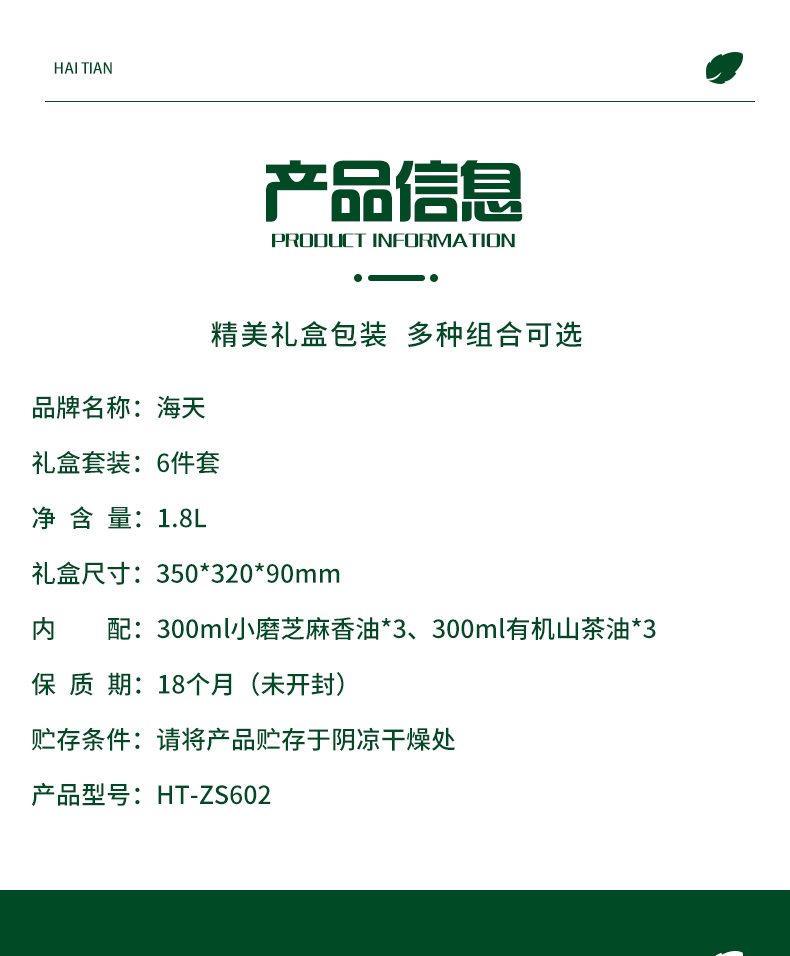 商品名称:海天 小磨芝麻香油有机山茶油六件套HT-ZS602 300ml小磨芝麻香油、有机山茶油*3