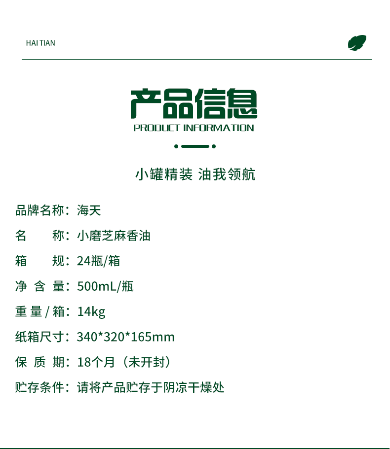 商品名称:海天 小磨芝麻香油500ml铁桶 500ml 优选醇正芝麻原料 100%纯芝麻