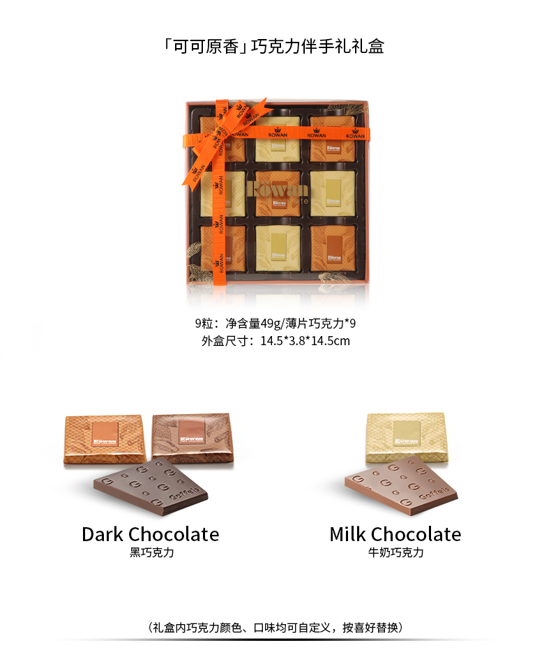 Rowan可可果pvc礼盒装49g*9粒 入口绵密,牛奶口味醇正不甜腻,黑巧口味丝滑不酸涩